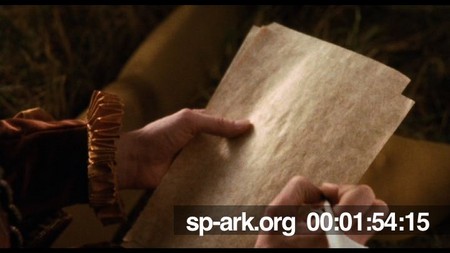 Description Close up of Orlando's cuffs and hands withdrawing a quill from a piece of paper