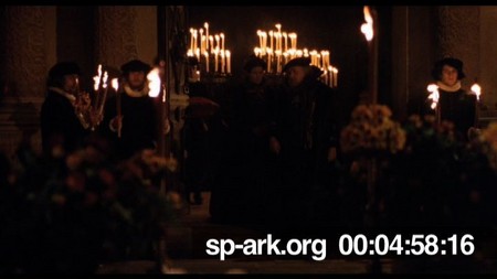 Description Exterior of Great House at night, lit up with torches. Long shot of Orlando's parents walking towards camera looking for Orlando