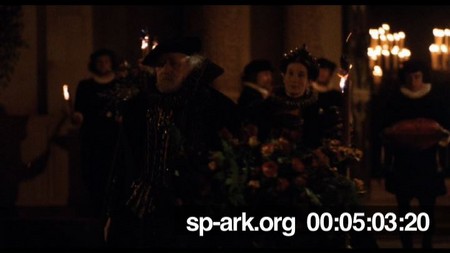 Description Exterior of Great House at night, lit up with torches. Medium shot of Orlando's parents walking towards camera looking for Orlando
