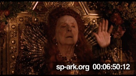 Description Medium shot of Queen Elizabeth raising her hand to stop Orlando's poetry recital.