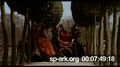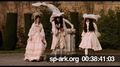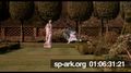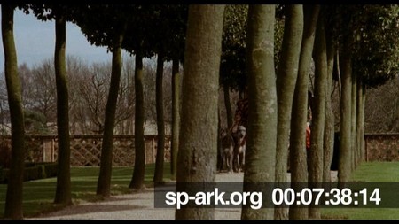 Description Tracking long shot of Orlando and Queen Elizabeth walking grounds of the Great House accompanied by Courtiers