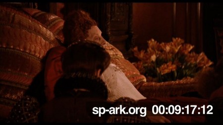 Description Queen Elizabeth lying on bed, servants bowing to her