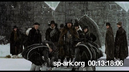 Description Long shot of King James' servants skating ahead of him, laying silver carpets on ice for him to step on.