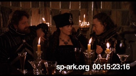 Description Medium shot of Sasha sitting between Lord Francis Vere and the Earl of Moray in royal tent.