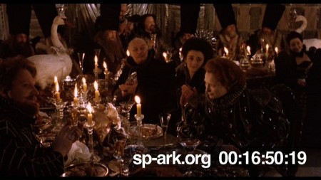Description High angle shot of Orlando, Euphrosyne and other guests applauding the players impending performance, Orlando is looking at Sasha