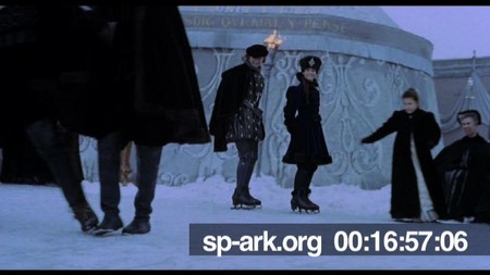 Description long shot of Orlando and Sasha slowly skating and talking.