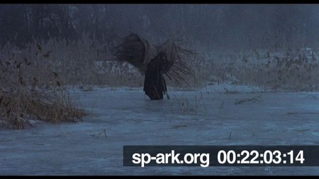 Description long shot of an old woman hobbling over the ice, carrying a bundle of sticks on her back.
