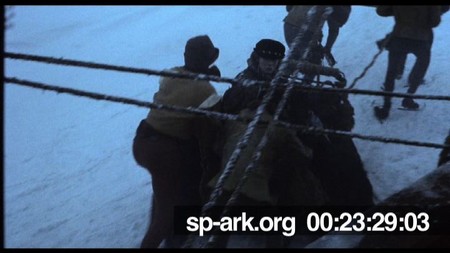 Description high angle shot of Orlando being pulled away from Russian ship on sledge.