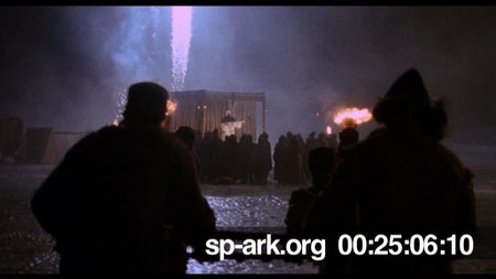 Description point of view shot of sledge moving towards small stage performance of Othello.