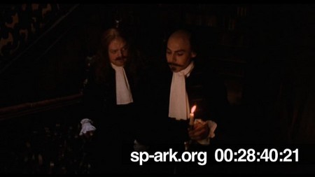 Description high angle shot of staircase in Great House being ascended by two of Orlando's attendants.
