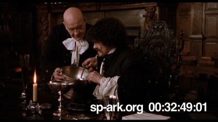 Description medium shot of Nick Greene ladelling broth from serving dish into bowl.
