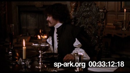 Description medium shot of Nick Greene speaking to Orlando across large dining table.