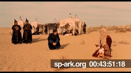 Description long shot of Orlando on his knees with the Khan crouching and talking to him