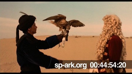Description medium shot of the Khan demonstrating falconry to Orlando.