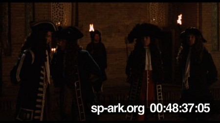 Description four servants conferring in courtyard at the Khan's palace.