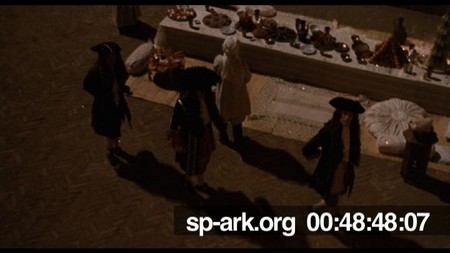 Description overhead shot of four servants moving into position beneath the platform on which Orlando and Archduke Harry stand.