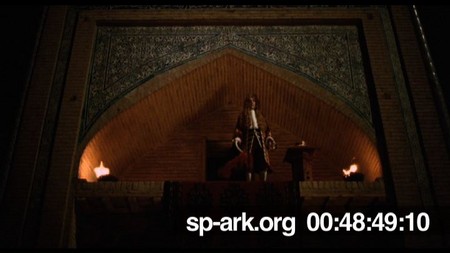 Description low angle shot of Archduke Harry and Orlando appearing on ceremonial platform to quiet applauding of servants.