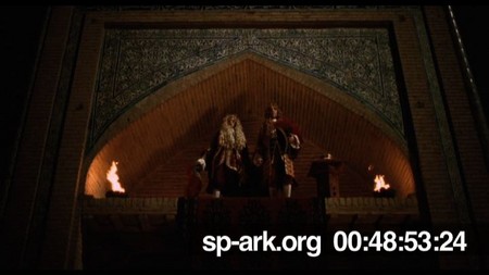 Description low angle shot of Archduke Harry and Orlando appearing on ceremonial platform to quiet applauding of servants.