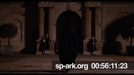 Description establishing shot of Orlando filmed from behind, approaching Great House in black robes.