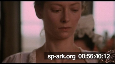 Description close up of Orlando being dressed by servants, she observes herself in mirror.