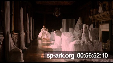 Description long shot of Orlando in white dress walking through corridor past furniture covered in white sheets.