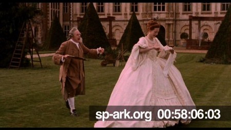 Description medium long shots of Orlando walking through grounds of Great House while servant gives her invitations.