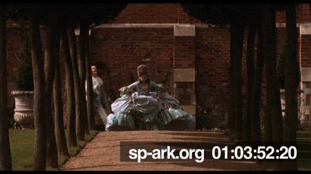Description Orlando walking towards camera in grounds of Great House, followed by Archduke Harry and servants.