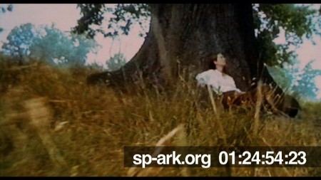 Description Shot from Orlando's daughter's point of view through video camera, long shot through grass of Orlando sitting against the oak tree