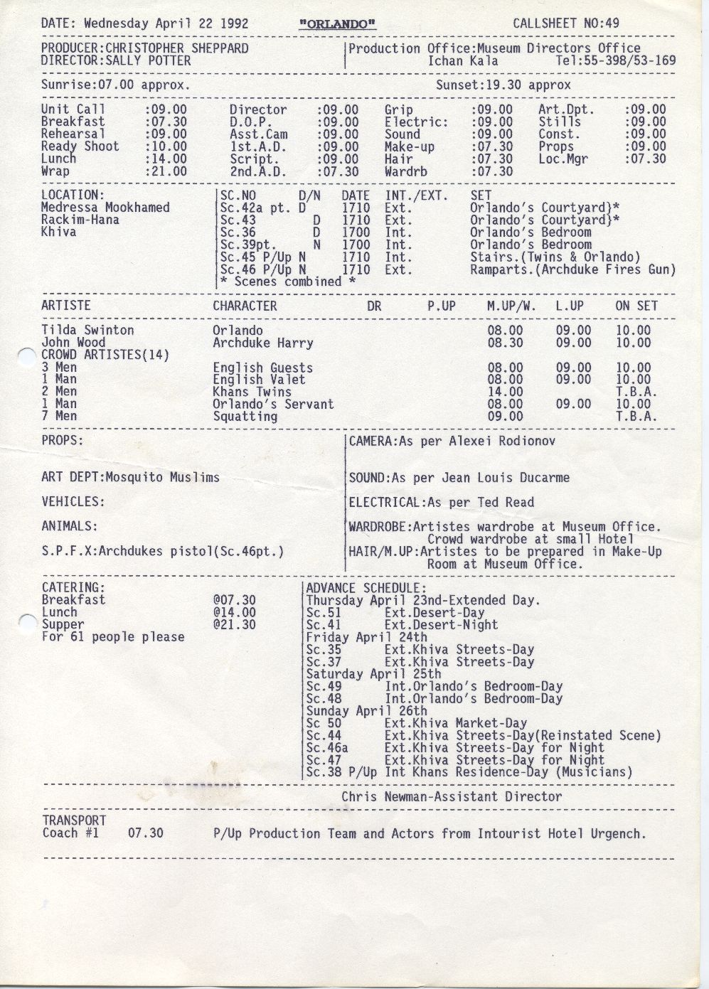 Description Orlando call sheet 49, Black and white A4 computer printed, Paper