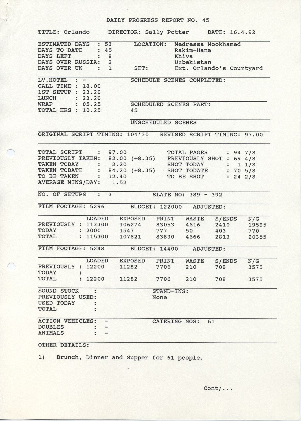 Description Orlando Daily Progress Report No.45, Black and white A4 computer printed, Paper