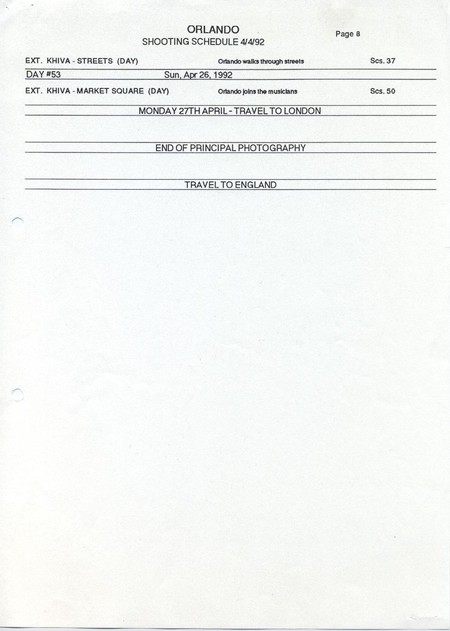 Description Orlando Shooting Schedule page 8, version 2, Black and white A4 computer printed, Paper