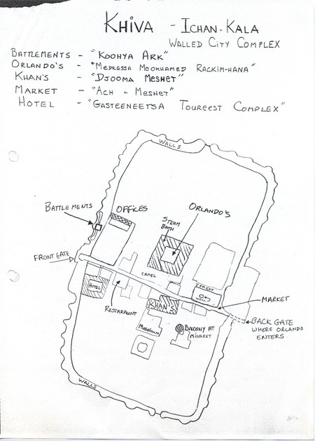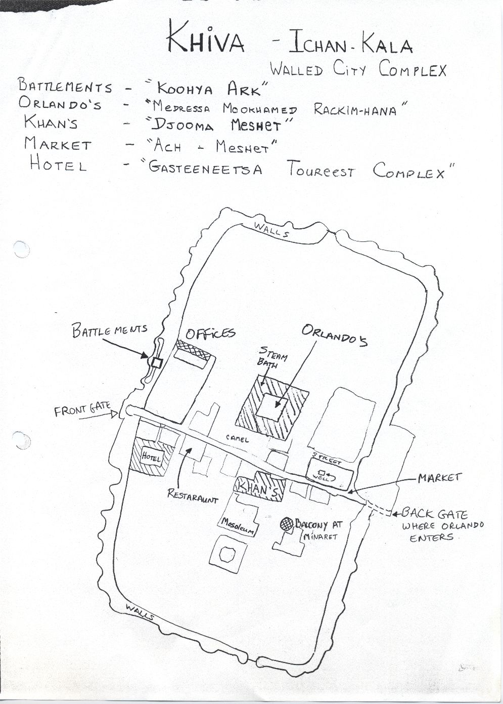 Description Map of Khiva Walled City Complex, Black and white A4 hand drawn, Paper