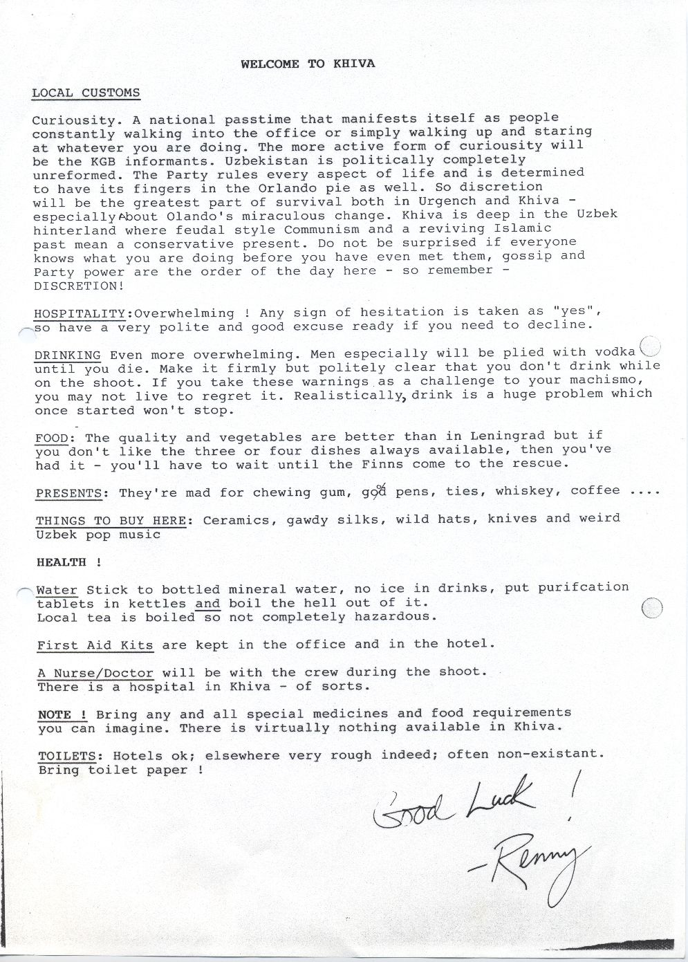Description Welcome to Khiva’ information sheet, Black and white A4 computer printed, Paper