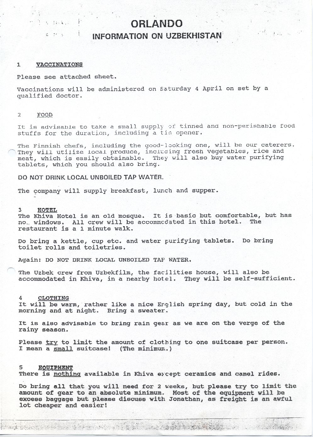 Description Orlando Information on Uzbekhistan page 1, Black and white A4 computer printed, Paper