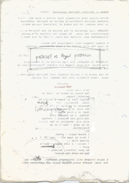 Description Black and white A4 computer printed with handwritten annotations, bound into book, Paper,Orlando Sally Potter’s Shooting Script page 1 back