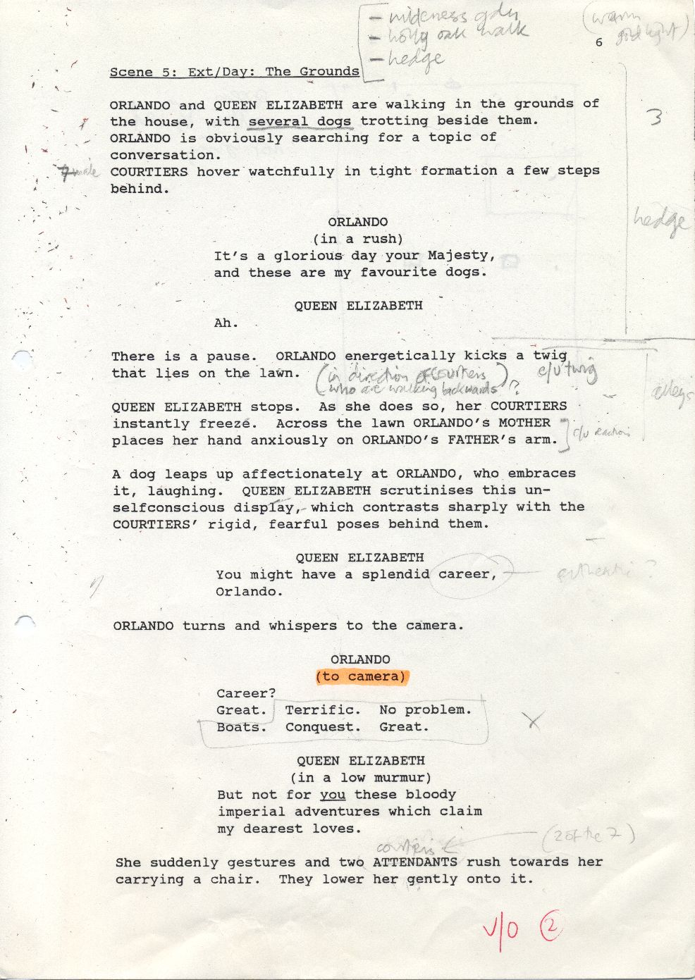 Initially, Sally Potter had the narrative of Orlando living each moment as the present. For instance Orlando in 1592, tells the story as if it were 1592; the Orlando in 1700 tells the story as if it were 1700, etc. However, later this changed and bore more resemblance to Virginia Woolf's prose. The film took on the structure of memories, the present being 1992. Therefore, the narrative of the film did not alter with the aging/ developing of character. The narrator of the film is the female mother Orlando, and thereby tone and language differs from the language of a young boy. In the part of "Death" we can see many differences between Potter's shooting script and the finalized version in her process of adapting Virginia Woolf's novel "Orlando".