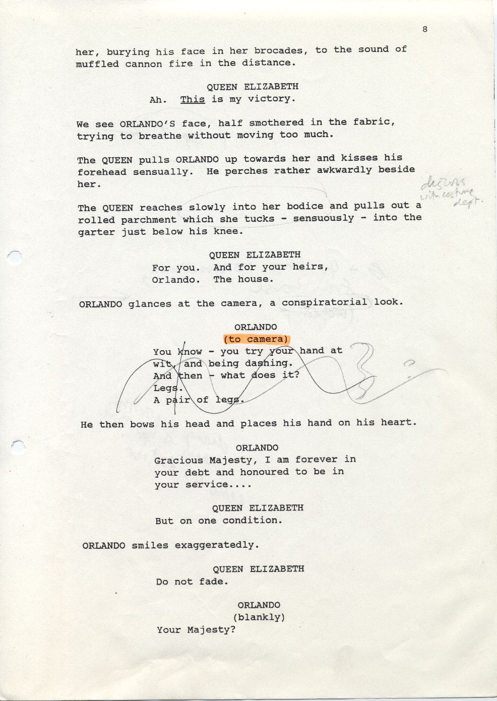 Description Black and white A4 computer printed with handwritten annotations, bound into book, Paper,Orlando Sally Potter’s Shooting Script page 8 front