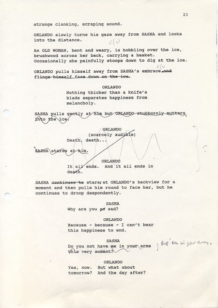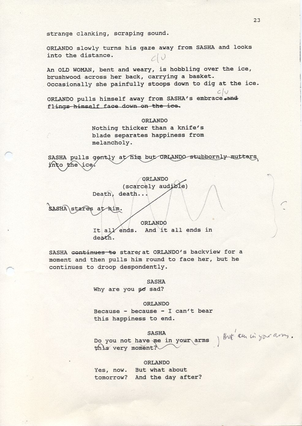 Description Black and white A4 computer printed with handwritten annotations, bound into book, Paper,Orlando Sally Potter’s Shooting Script page 23 front