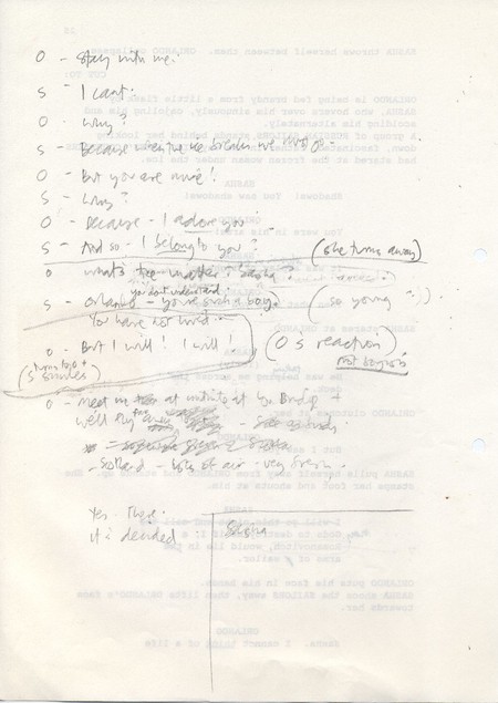 Description Black and white A4 computer printed with handwritten annotations, bound into book, Paper,Orlando Sally Potter’s Shooting Script page 25 back