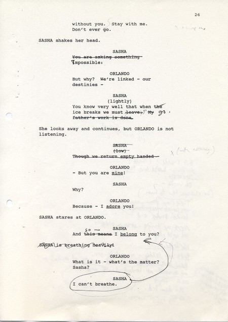 Description Black and white A4 computer printed with handwritten annotations, bound into book, Paper,Orlando Sally Potter’s Shooting Script page 26 front