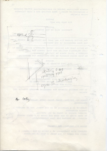 Description Black and white A4 computer printed with handwritten annotations, bound into book, Paper,Orlando Sally Potter’s Shooting Script page 32 back