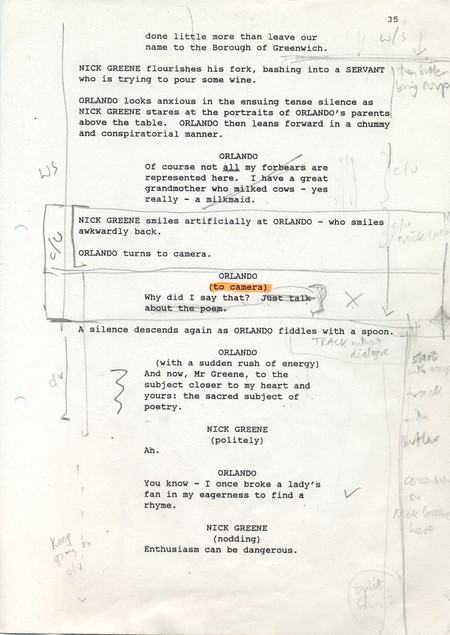 Description Black and white A4 computer printed with handwritten annotations, bound into book, Paper,Orlando Sally Potter’s Shooting Script page 35 front