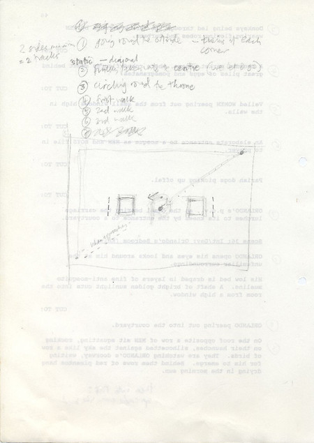 Description Black and white A4 computer printed with handwritten annotations, bound into book, Paper,Orlando Sally Potter’s Shooting Script page 46 back