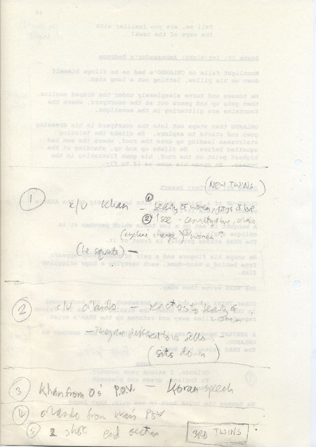 Description Black and white A4 computer printed with handwritten annotations, bound into book, Paper,Orlando Sally Potter’s Shooting Script page 49 back
