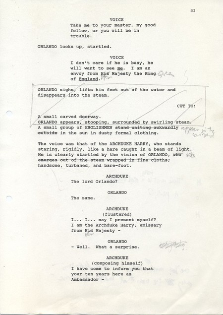 Description Black and white A4 computer printed with handwritten annotations, bound into book, Paper,Orlando Sally Potter’s Shooting Script page 53 front