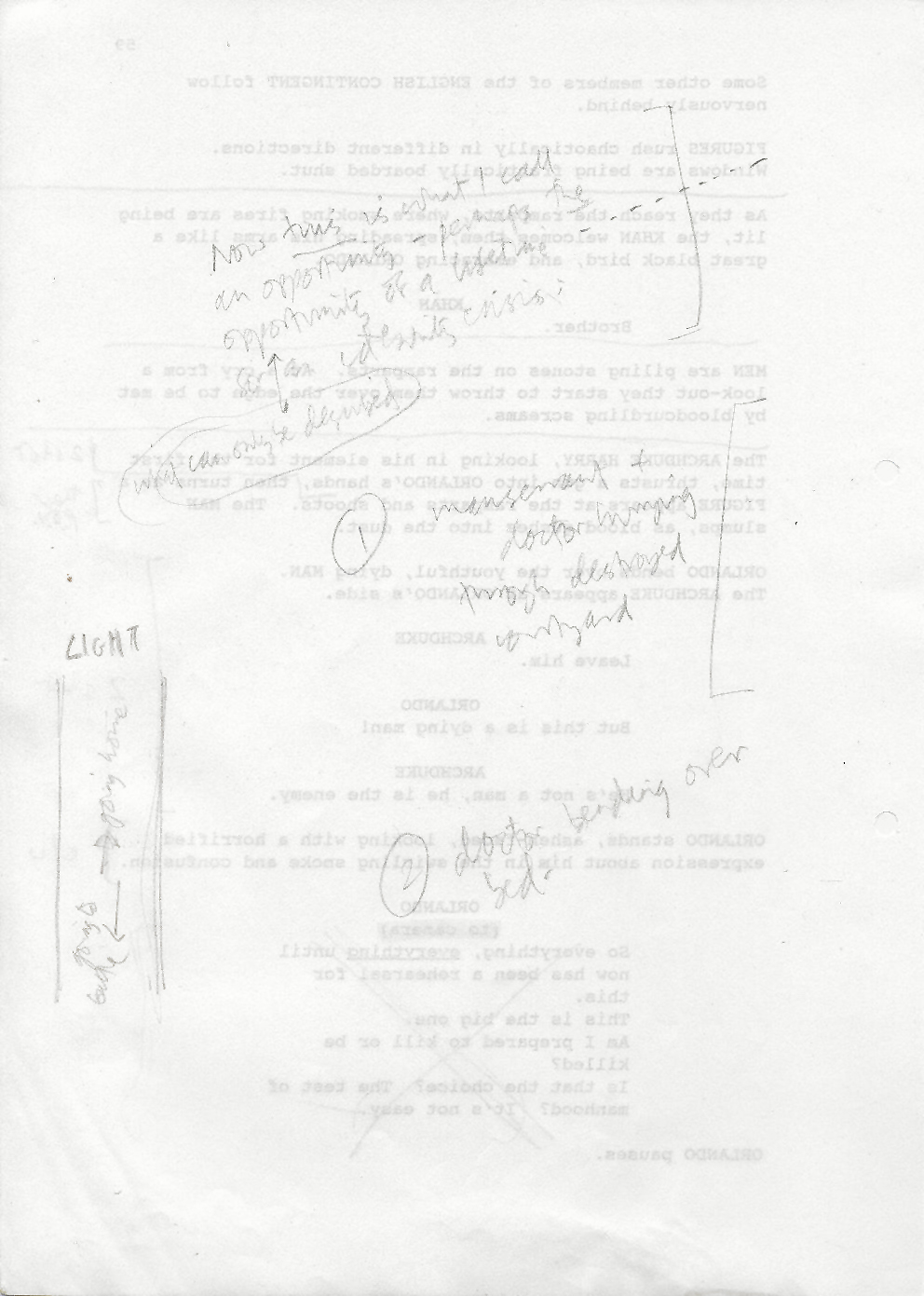 Description Black and white A4 computer printed with handwritten annotations, bound into book, Paper,Orlando Sally Potter’s Shooting Script page 59 back