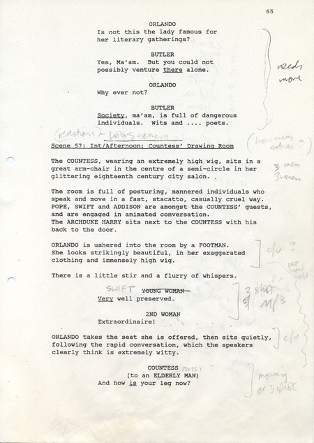 Description Black and white A4 computer printed with handwritten annotations, bound into book, Paper, Orlando Sally Potter’s Shooting Script page 65 front