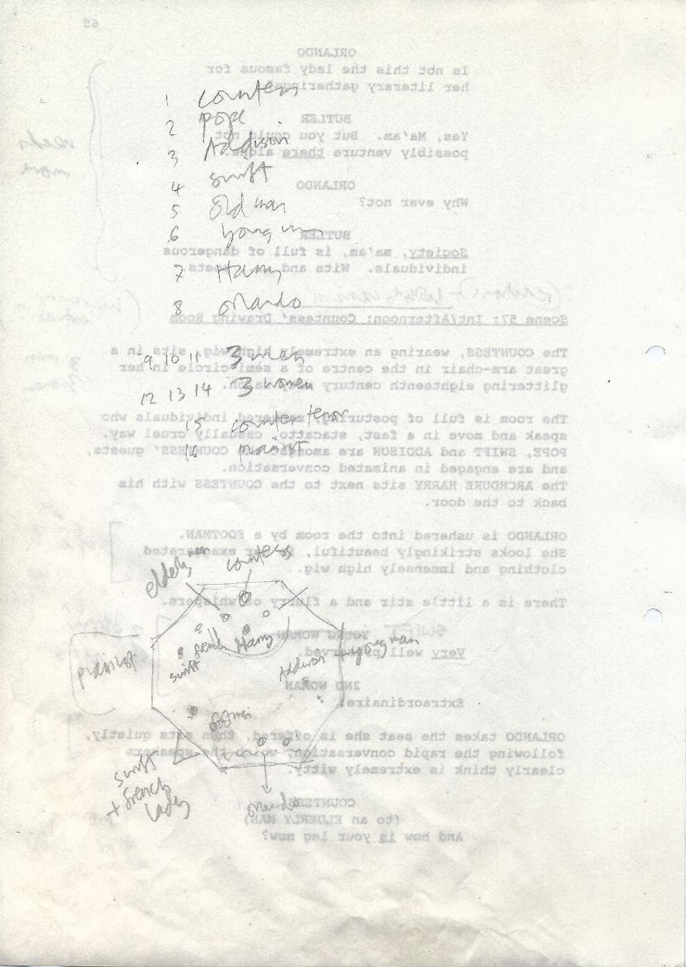 Description Black and white A4 computer printed with handwritten annotations, bound into book, Paper, Orlando Sally Potter’s Shooting Script page 65 back