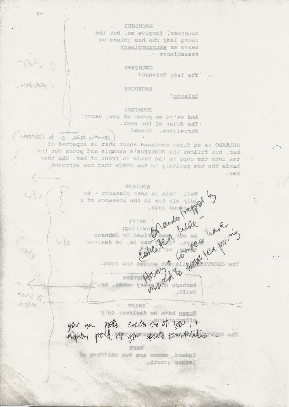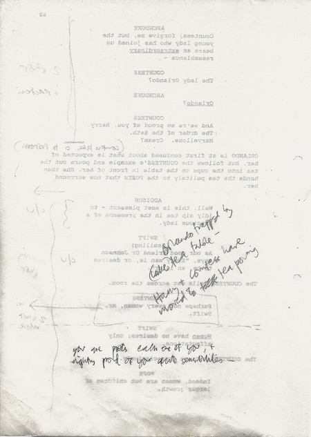 Description Black and white A4 computer printed with handwritten annotations, bound into book, Paper, Orlando Sally Potter’s Shooting Script page 68 back