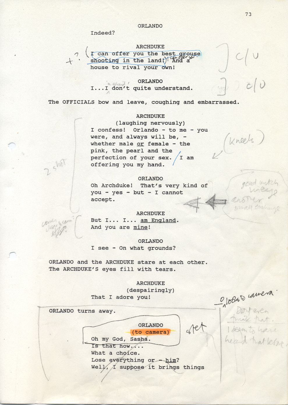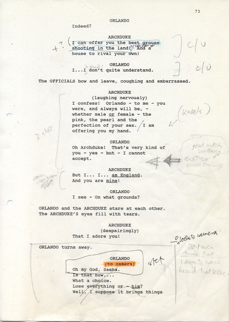 Description Black and white A4 computer printed with handwritten annotations, bound into book, Paper, Orlando Sally Potter’s Shooting Script page 73 front